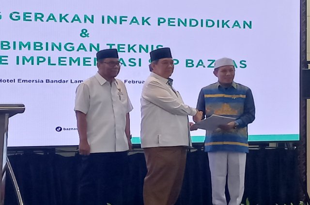 Bintek Mekanisme Implementasi SOP BAZNAS dibuka oleh Gubernur Lampung Rahmat Mirzani Djausal, diwakili oleh Asisten Bidang Pemerintahan dan Kesra Dr. M. Firsada, dihadiri Ketua BAZNAS RI Prof. Ir. HM. Nadratuzzaman Hosen, MS, MEc. Ph.D.