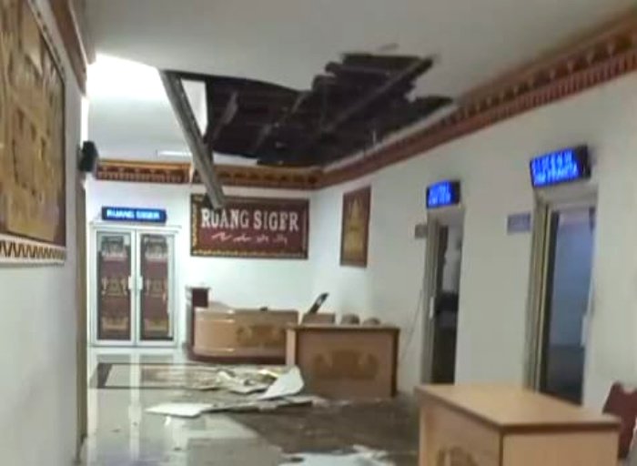 Sejumlah plafon di ruang lobi utama dan area depan ruang rapat Siger tepat di sekitar ruang asisten runtuh. Kerusakan itu terjadi saat hujan deras mengguyur Kotabumi pada sore hari.