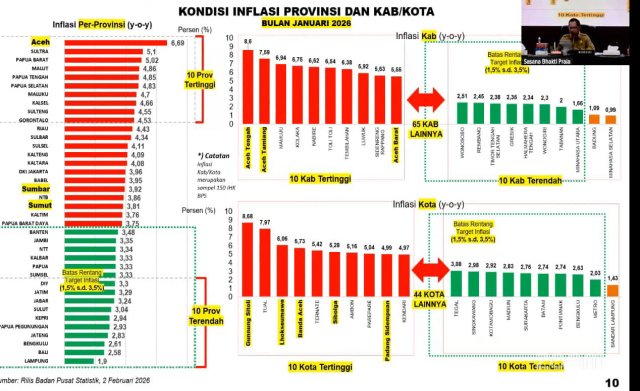 Meski demikian, Tito menekankan bahwa jika dilihat dari inflasi month to month, kondisi nasional justru menunjukkan deflasi dari 0,64 persen pada Desember menjadi -0,15 persen pada Januari, yang merupakan kabar baik karena menunjukkan harga barang dan jasa relatif terkendali. Penyumbang deflasi berasal dari kelompok makanan dan minuman (-1,03 persen) serta transportasi (-0,46 persen).