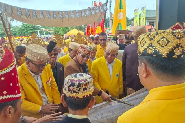 Dalam kesempatan ini, Musa Ahmad mantan Bupati Lamteng memberikan penghargaan kepada Ketua Golkar Lampung Hanan A Rozak berupa keris.