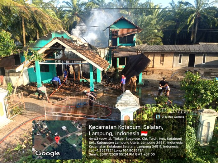 Kotabumi, Warta9.com – Kebakaran melanda sebuah rumah milik H. Abu Ma’ruf, di Jalan Tjokel Subroto, Kelapa Tujuh, Kecamatan Kotabumi Selatan, Kabupaten Lampung Utara, Senin (26/1/2026) sore tadi sekitar 15.30 WIB.
